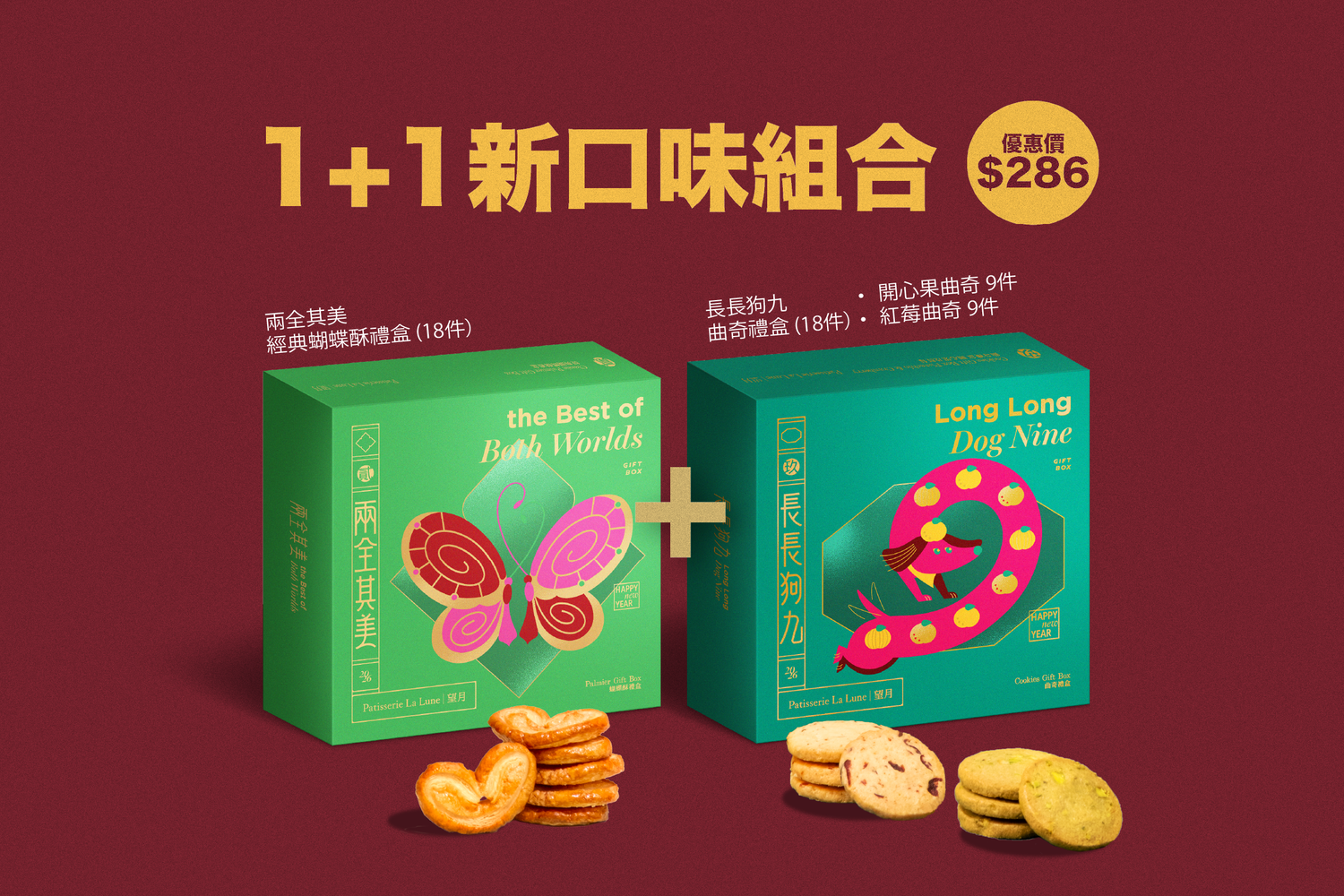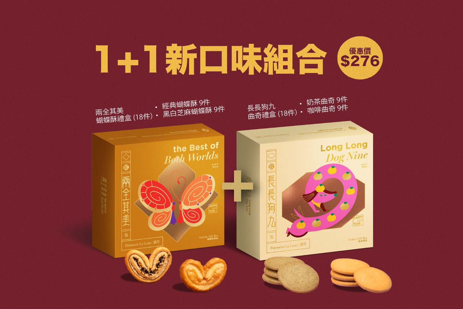 ⭐ 兩全其美蝴蝶酥禮盒(經典+黑白芝麻)(18件) x1⭐ 長長狗九曲奇禮盒(奶茶+咖啡)(18件) x1