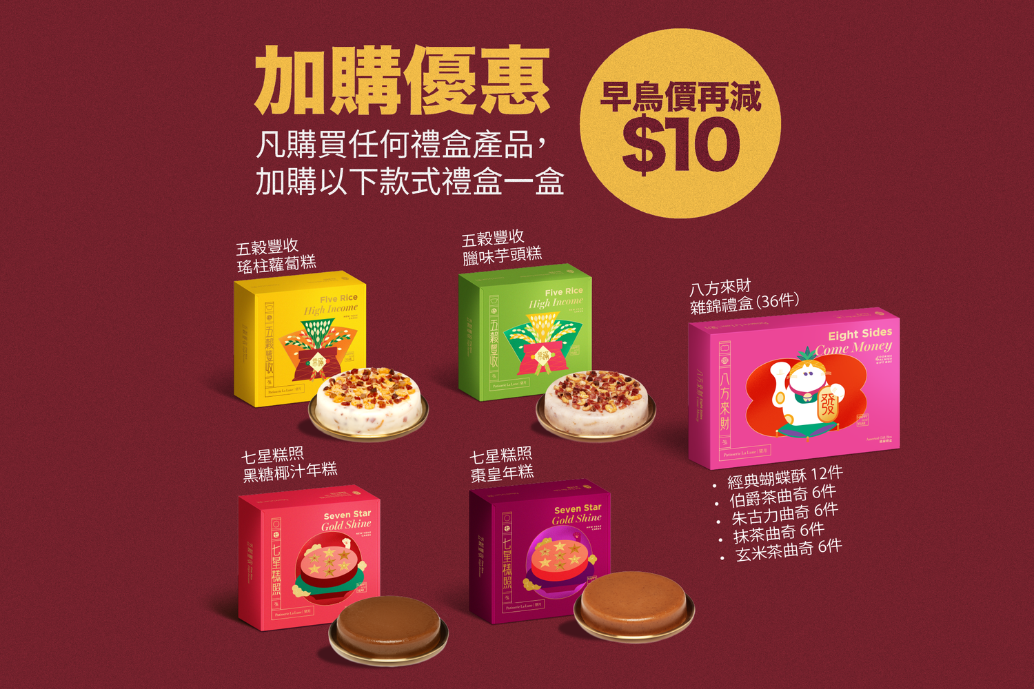 凡購買任何禮盒產品,加購以下款式禮盒一盒,早鳥價再減$10