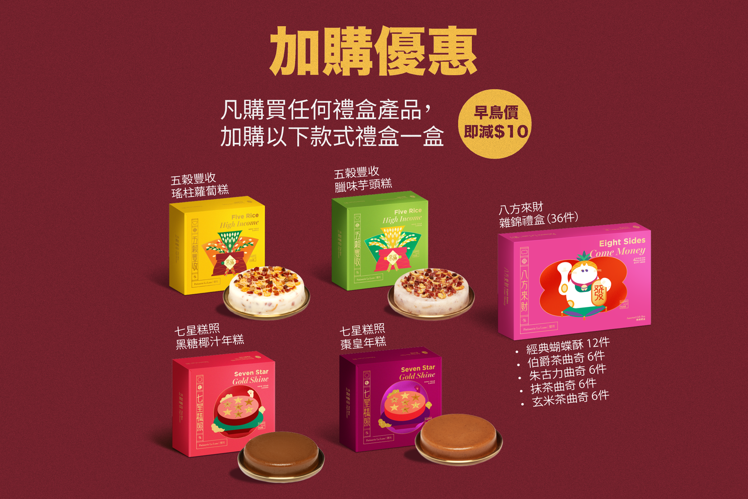 凡購買任何禮盒產品,加購以下款式禮盒一盒,早鳥價即減$10⭐ 五穀豐收瑤柱蘿蔔糕⭐ 五穀豐收臘味芋頭糕⭐ 七星糕照黑糖椰汁年糕⭐ 七星糕照棗皇年糕⭐ 八方來財雜錦禮盒(36件)*結算時會自動計算折扣優惠