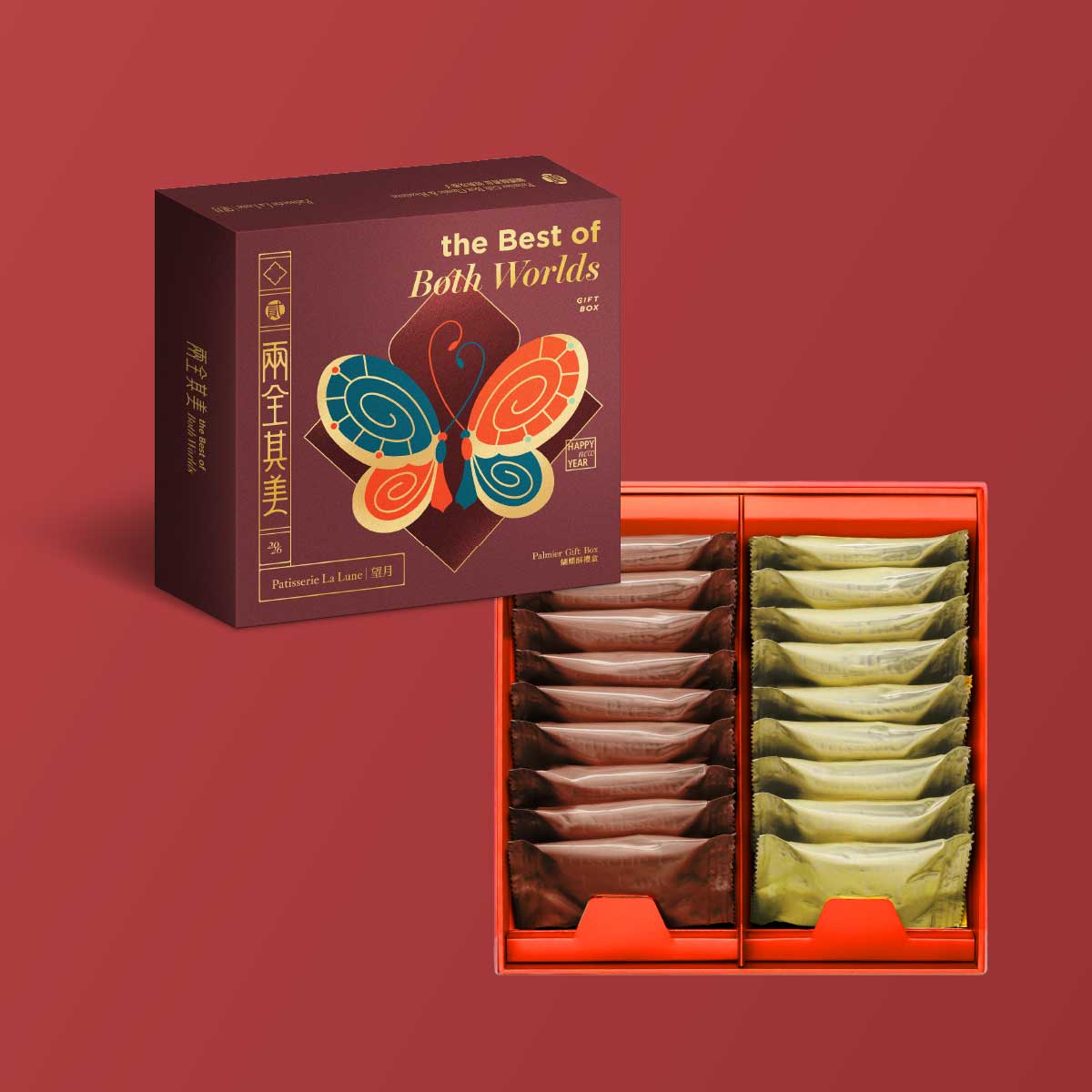 一個禮盒有齊望月經典蝴蝶酥(9件)及榛子蝴蝶酥(9件)兩款口味,一次過滿足饞嘴的快感。