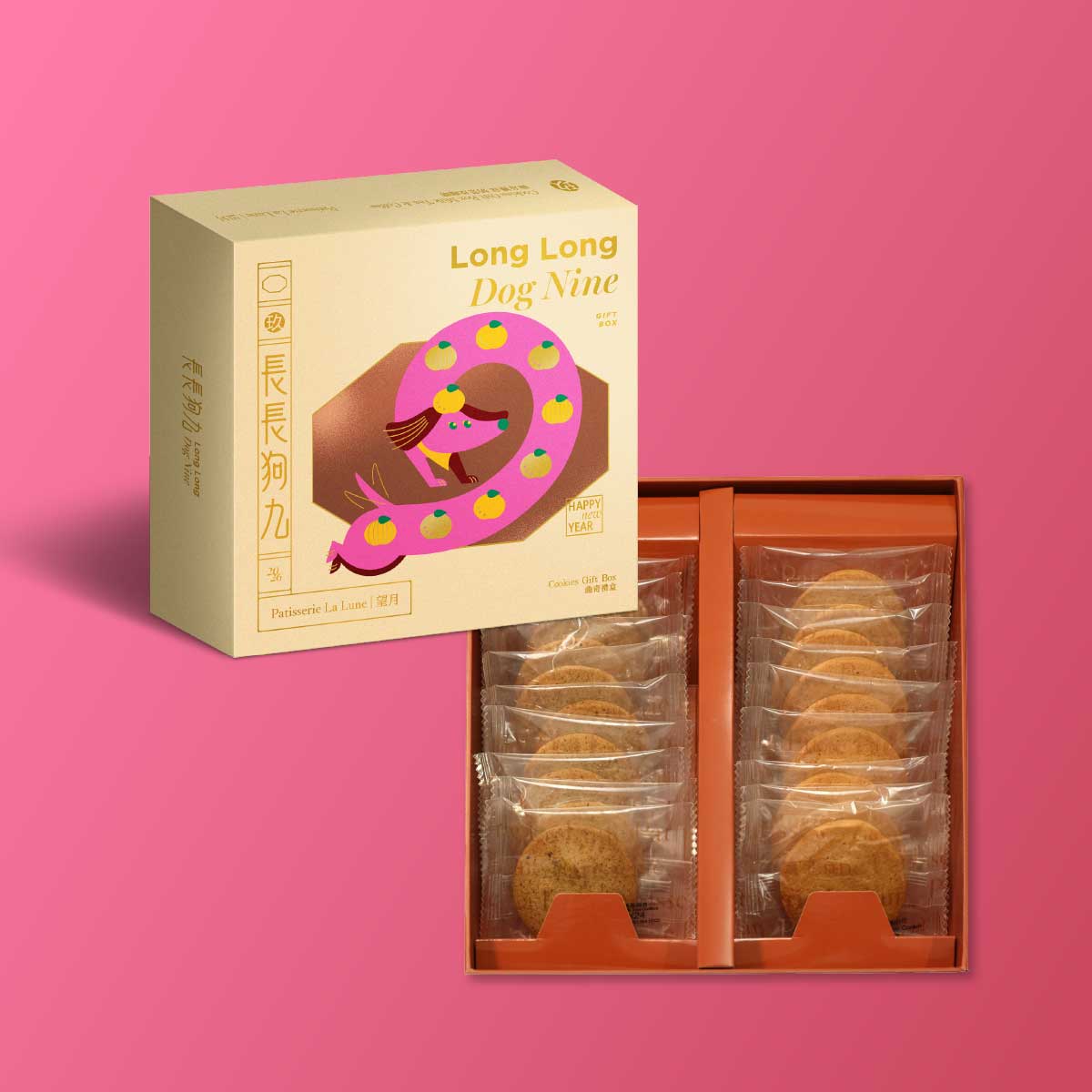 包裝設計以長形狗狗作為圖案,象徵長長久久,關係愈陳愈香。禮盒內包含蘊藏奶茶曲奇(9件)和咖啡曲奇(9件)兩款產品,絕對是啡茶愛好者不二之選。